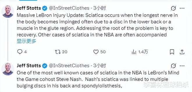 医学专家杰夫·斯托茨解析了詹姆斯的伤情,他在推特上写道:“勒布朗重伤更新:坐骨神经痛是指身体最长的神经受到压迫产生疼痛,通常是由于腰椎间盘或臀部肌肉受损所致。解决问题的根源是康复的关键。NBA中的其他坐骨神经痛的病例往往持续相当长的时间。”