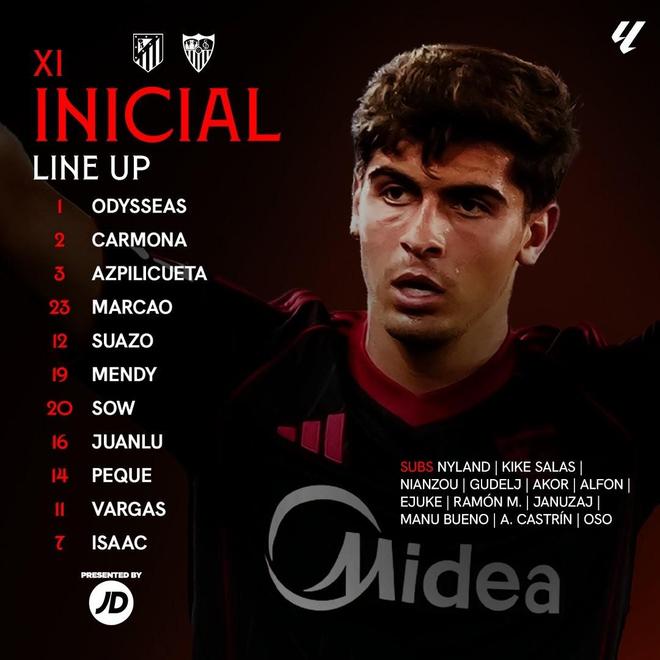 塞维利亚首发:1-弗拉乔季莫斯、2-何塞-安赫尔、3-阿斯皮利奎塔、12-加布里埃尔-苏亚索、23-马尔康-特谢拉、19-巴蒂斯塔-门迪、20-索乌、16-胡安卢-桑切斯、14-佩克-费尔南德斯、11-鲁文-巴尔加斯、7-伊萨克-罗梅罗